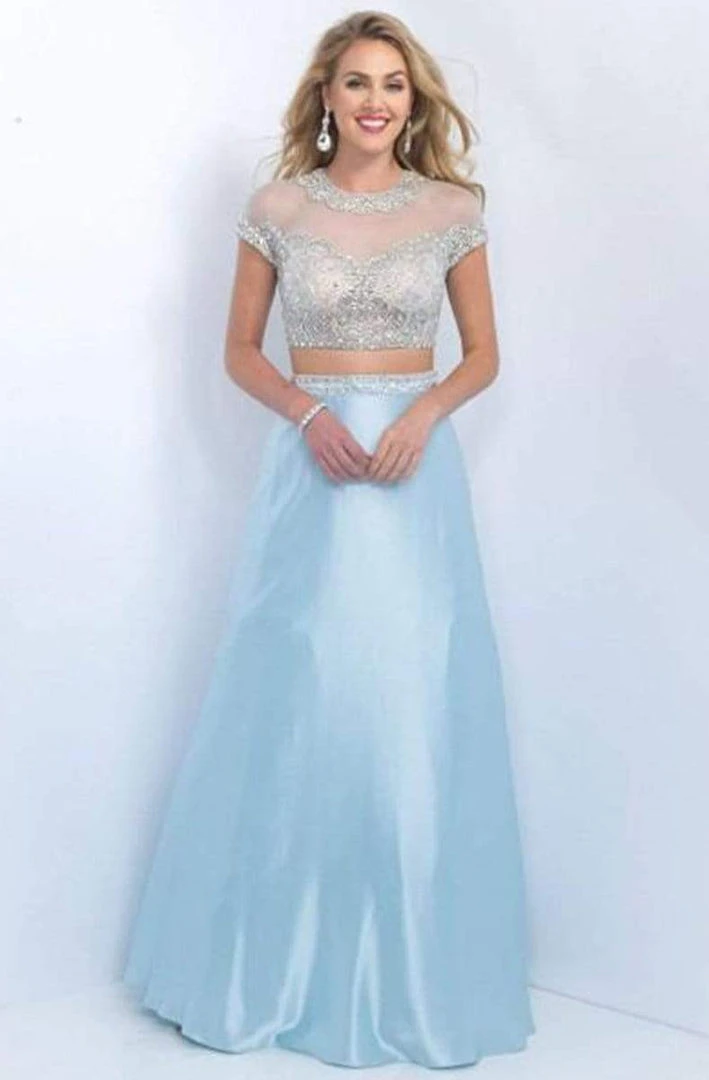 Draw out the princess in you with this two-piece evening dress by Blush Intrigue 155. The illusion jewel neckline bodice has attractive short sleeves and sparkling crystal details in all the right places. This fashionable and fun two-piece ensemble shimmers to the full-length A-line silhouette hem in special gleaming waves for a picture prefect princess look. Be in this gorgeous Blush creation and leave a lasting impression.