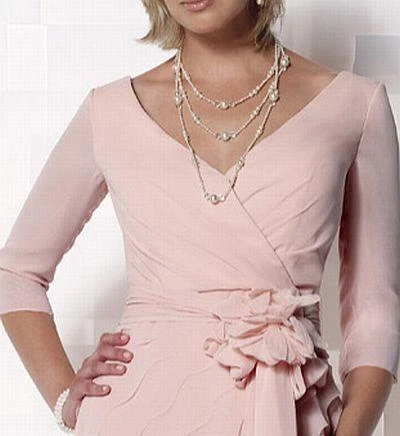 Mock wrap chiffon A-line dress with three-quarter length sleeves, front and back V-necklines, ruched natural waistband with removable hand-crafted flower accent and cascading streamers, diagonally tiered and scalloped skirt. Model is wearing Shell Pink color. Find more mother of the bride dresses!