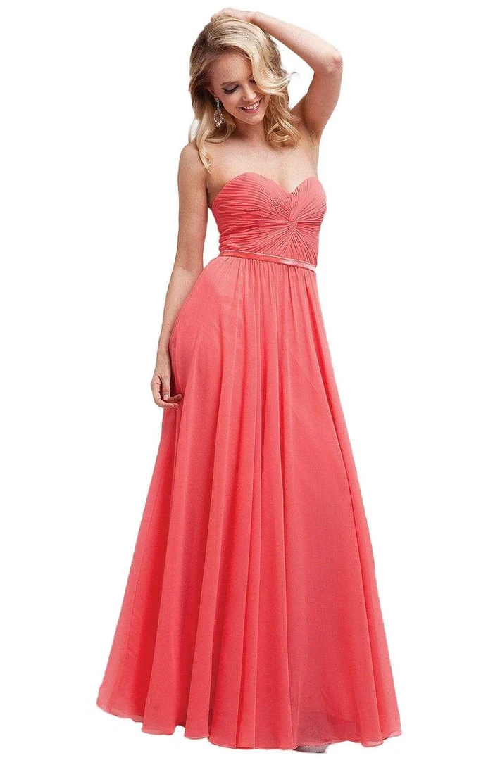 Make it a moment to shine in this Cinderella Divine 7455. This gown shows off a strapless style and features sweetheart neckline on a ruched bodice. A thin band is put around natural waist and then it parades a flowy chiffon A-line silhouette in full length with a romantic sweep train finish as you walk. Exude a timeless appeal in this elegantly ornate Cinderella Divine masterpiece.
