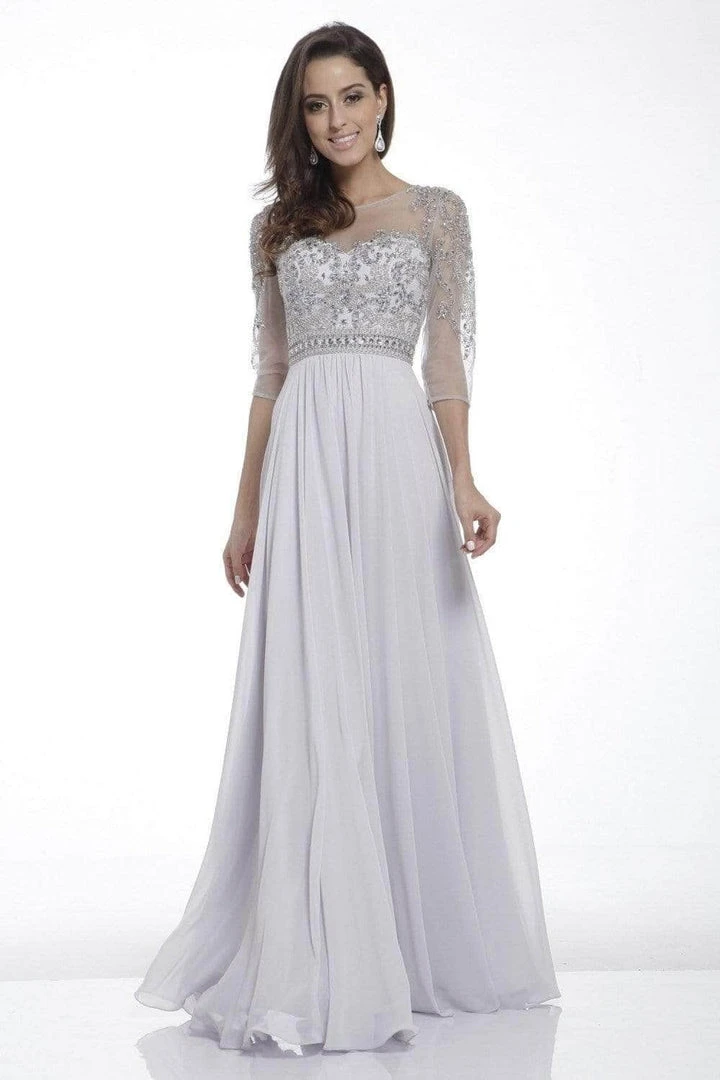 Appeals in a bateau neckline with sheer quarter length sleeves and fitted bodice adorned with beading. This chiffon dress has a back zipper closure and from the waist flourishes a full length, flowy A-line skirt. Model is wearing the Silver color.