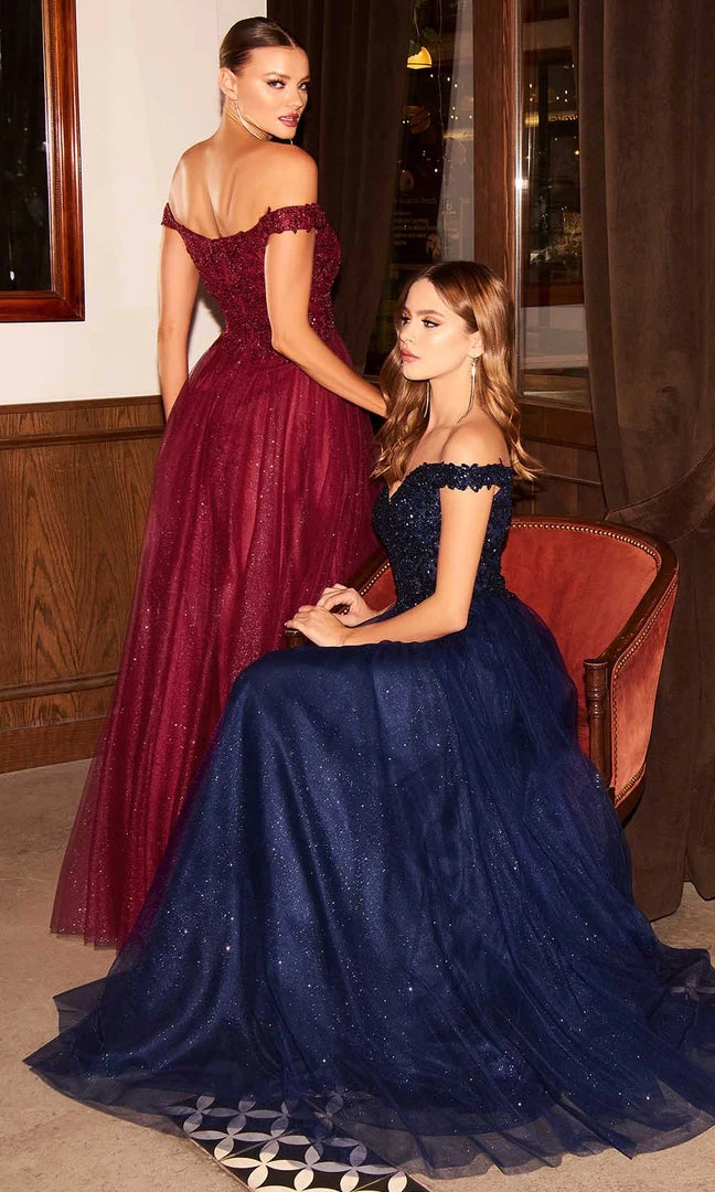 Radiate enchanting beauty in this stellar gown by Cinderella Divine CD0177. An off-shoulder sweetheart neckline tops this metallic lace appliqued bodice that stunningly sparkles with crystal beadings. The gown features a glitter tulle overlay skirt that parades with fine gathers waving into a complete A-line silhouette. This Cinderella Divine creation is truly a definition of glamour.