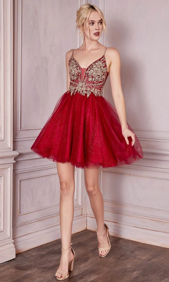 Shine with optimum elegance and feminine flair in this Cinderella Divine CD0190 creation. Detailed with metallic floral lace appliques and beadwork, this spaghetti strap dress features a deep v-neckline with a sheer inset. Crafted with a low v-open back, the glitter skirt flares into a short hemline. Enchant everyone by the fascinating style of this Cinderella Divine masterpiece. Whether you are looking for a unique prom dress to stand out, bridesmaid dresses or Mother of the Bride dress for that special day, or just an evening dress for a special night out, Cinderella Divine has your dress at the right price. Models are wearing Blush, Burgundy-Gold, Champagne, Lilac, Smoky Blue colors.