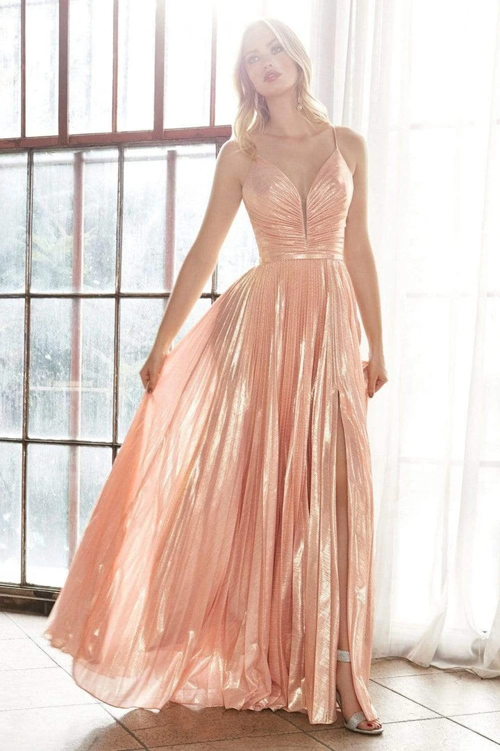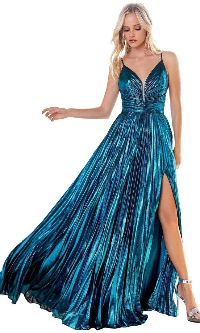 Indulge in decadent style as you feature your finest assets in this sleekly tailored Cinderella Divine CD161 Prom Dress. Draped in brilliant metallic lame, this lustrous gown presents a plunging v-neckline with sheer mesh inset between the split ruched bodice. The dress is crafted in sleeveless frame with spaghetti straps to show off those shapely shoulders while the back is designed with a mid-open back and is nipped with a slender self-fabric band around the natural waist. The sleek full-skirt flourishes a finely gathered waist that flares magnanimously down the floor while revealing a thigh-high leg slit. Stun from all angles with your alluring yet refreshing style in this glamorous Cinderella Divine masterpiece.