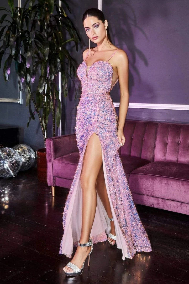 Be the delight of everyone’s eyes in Cinderella Divine CD176. This sequined dress features a sleeveless, deep V-neckline with spaghetti straps. It has a figure-flattering bodice with sheath skirt styled with a high leg slit. Orchestrate your moment to stand out in this Cinderella Divine dress.