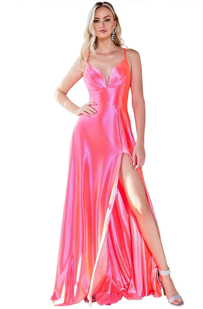 This Cinderella Divine CD903 is a charming choice for your next special occasion. This satin gown showcases a sleeveless plunging V-neckline with thin straps. The fitted bodice highlights your curves and features an A-line skirt with a high leg slit. Capture the glamour as you walk on this fabulous Cinderella Divine dress.