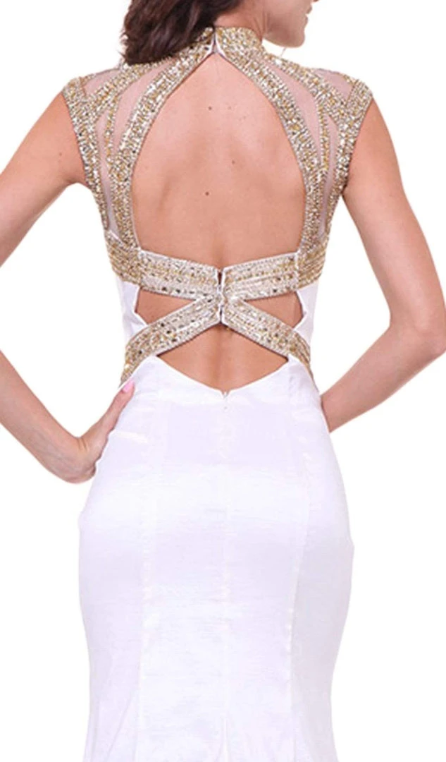 Let have all eyes on you in this marvelous masterpiece from Cinderella Divine 8760. Crystal embellishments stunningly adorn the sheer high neckline and border the sweetheart bodice as a front keyhole lies at the center of the sheer neckline. The fitted ensemble flares to the floor as it finishes with a beautiful sweep train for a dramatic effect. The open back is supported by thick crisscross strap forming cutout details. Light up the night in this eye-catching masterpiece from Cinderella Divine creation. Model is wearing Off White color.