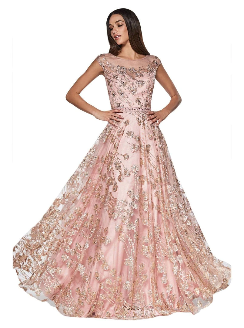 Elegantly designed in glitter floral pattern, this stunner boasts a fitted bodice framed with an illusion scoop neckline and cap sleeves over a distinct sweetheart lining. Fabulous pleats cascade the ballgown skirt as it flows to full length as the sheer full back is enclosed with a center zipper closure.