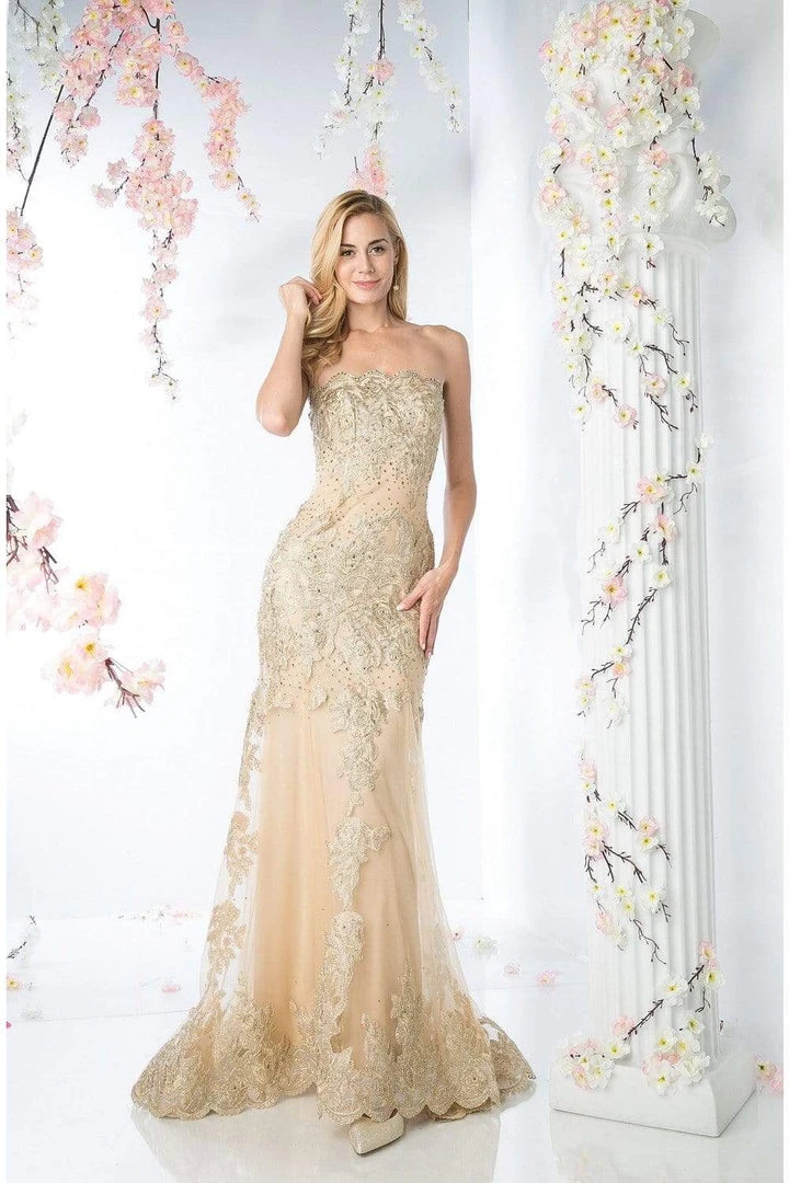 Embrace a wonderful evening in this wondrous formal gown by Cinderella Divine 8930. Brazens in a strapless, scalloped neckline with fitted bodice decked with gold appliques and beading that cascade to the full length sheath skirt with sweep train. The back has a zipper closure. Feminine, bold, and imperial, this gown from Cinderella Divine will definitely make you shine!