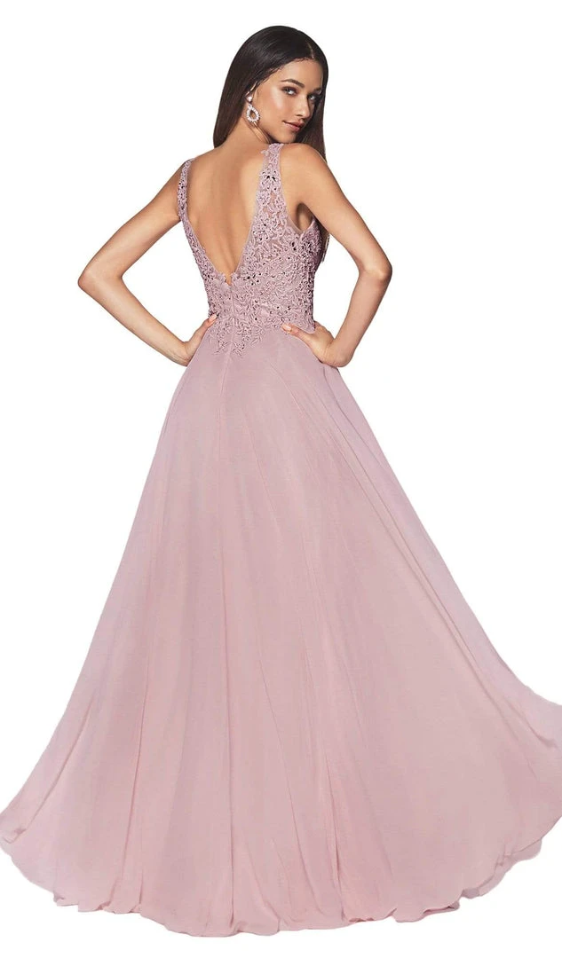 Be the ethereal vision to covet for in this Cinderella Divine UJ0123 creation. Lavishly flowing in soft chiffon, this dress starts with a set of beaded lace with tiny stones on a deep v-neckline bodice. With a matching with a deep v-design at the back, the A-line skirt cascades into an enchanting full-length hemline with a subtle train. Walk into a room and stun everyone with the elegance of this Cinderella Divine masterpiece. Models are wearing the Champagne, Blush and Mauve colors.