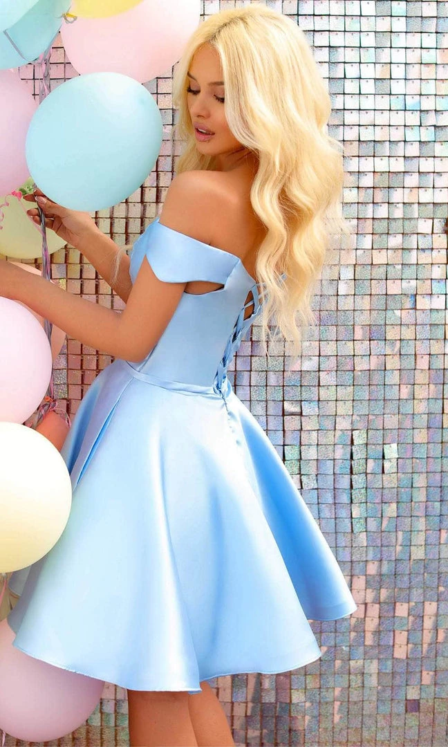 Achieve the next level of elegance in this Clarisse 30245 creation. This lovely dress features an off-shoulder sweetheart neckline, cap sleeves and a mid-open back with an alluring corset lace-up tie and zipper closure. Defined with thin set-on waistband and side pockets, the skirt is designed in pleats and it flares an A-line silhouette that flows in a short hemline. This Clarisse cocktail dress is a classic look that works for many special occasions.