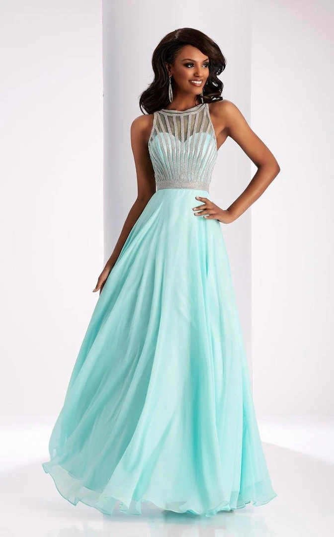 Singularize yourself as a fashion maven in this distinctive Clarisse 3068 creation. Shimmering with radiating stripes embellished on a sheer overlay, this beauty showcases a high illusion halter over a sweetheart neckline with cutaway shoulders. Designed with a racerback framed with tapering sheer straps, the back is festooned with a triangular cutout on an open back. Wrapped with a shimmering bejeweled waistband, the layered gossamer skirt flourishes soft pleats that flora stunningly down to a full-length hem. Inspire double takes as you walk by in this lavishly adorned Clarisse masterpiece. Models are wearing the Blush, Cobalt, Crimson and Seafoam colors.
