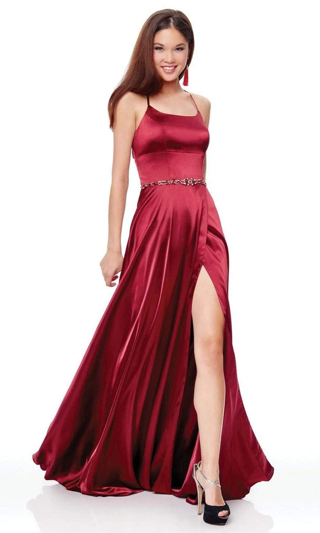 Heighten your charming appeal in this masterpiece by Clarisse 3712. Features a sleeveless, scoop neckline with back cutouts. The fitted bodice is cinched in an embellished belt. From the waist flourishes a full length charmeuse A-line skirt with a flattering slit and sweep train finish. The night is yours in a spectacular gown from Clarisse.