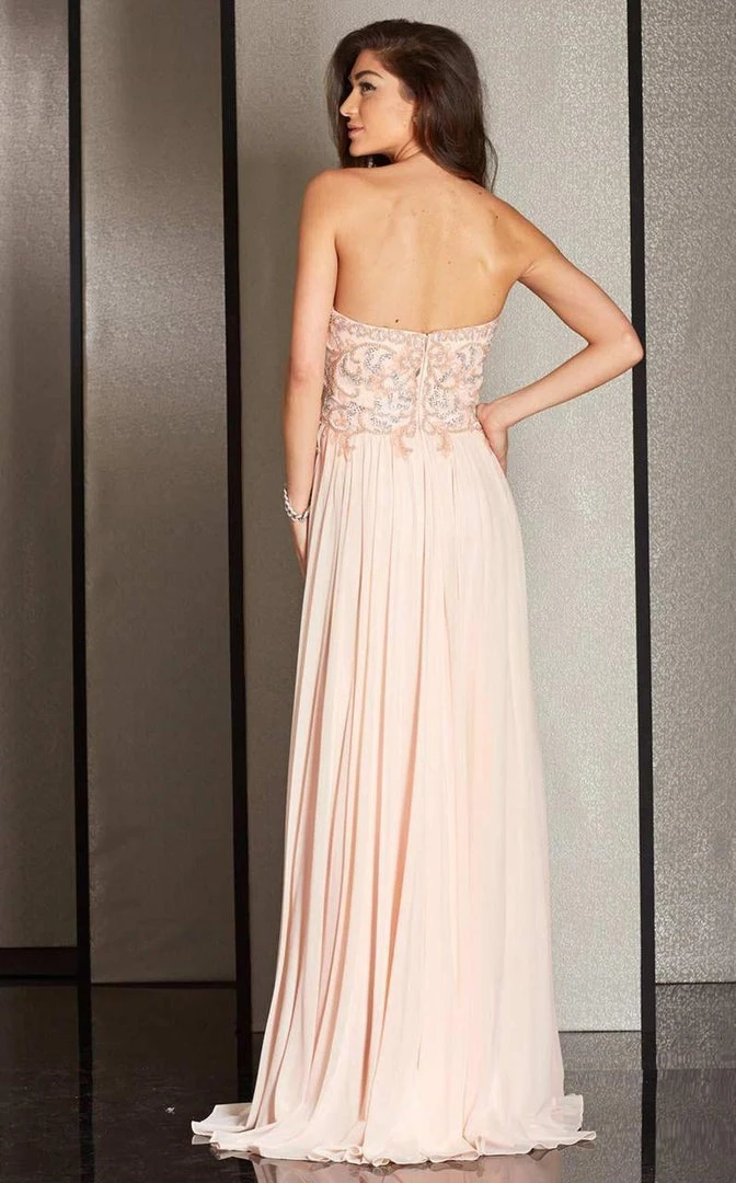 Look chic and seductive in this marvelous dress from Clarisse M6229. The strapless bodice has a figure satisfying sweetheart neckline and features a stylish display of twinkling beadwork and chic tonal adornments in a lavish scrolling pattern. Embellished at the waist, this lavish ensemble glides to the full-length hem in ethereal floating layers. Look sophisticated and mature in this simple yet chic creation by Clarisse.