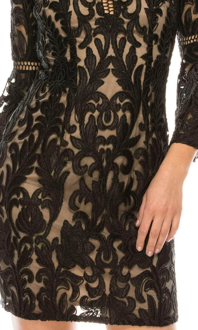 All eyes will be on you in this elegant Aidan Mattox MD1E201378 dress. This short dress fashions a bateau neckline supported by quarter length sleeves in an embroidered bodice. Revealing a sheath silhouette, this also shows a back keyhole with back zipper closure. Sizzle all night in this fabulous Aidan Mattox creation. Model is wearing Black color.