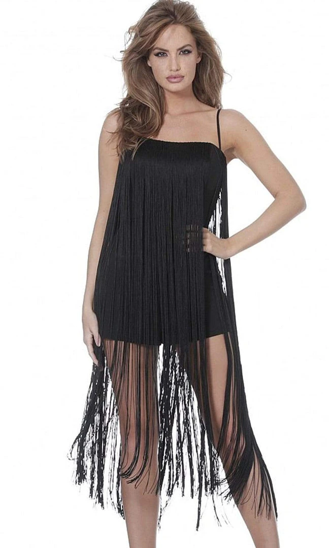 | Details: | Spaghetti Straps, Fitted, Sleeveless, Fringe Overlay, Short Hemline, Mid-Thigh Length, Open Back |