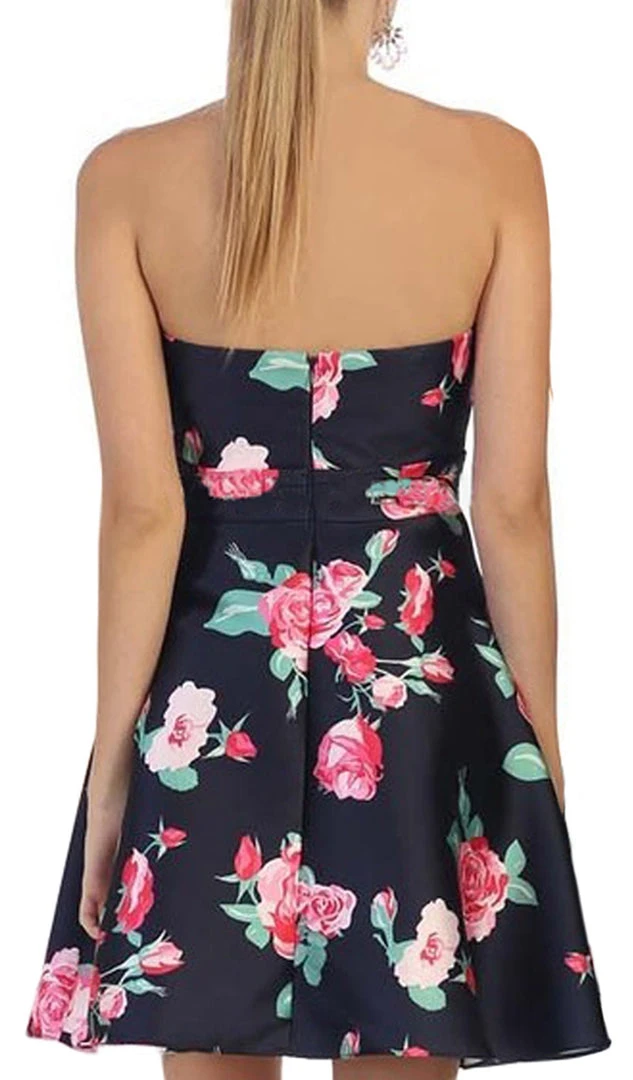 Walk the red carpet in style wearing this stunning cocktail dress by May Queen MQ1404. This strapless dress has a tailored bodice with sweetheart neckline. The nipped waist shows off a full skirt. This dress is covered with a vibrant floral print and finishes with a mini hem. This style by May Queen is perfect for an unexpected prom dress or any formal event!