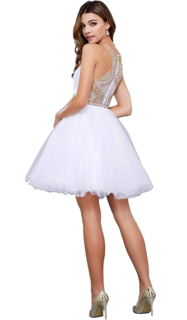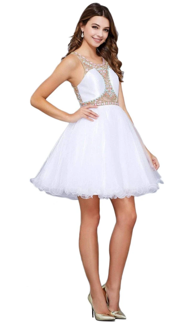 You will be an enchanting beauty in this charming cocktail dress by Nox Anabel 6250. This short dress features a?ÿsheer jewel neckline, sleeveless bodice adorned with pastel-colored beads, sheer illusion neckline, beautiful sheer beaded back, short flirty skirt with ruffled edges, and a zipper closure. This Nox Anabel design is a brilliant pick for any special party.