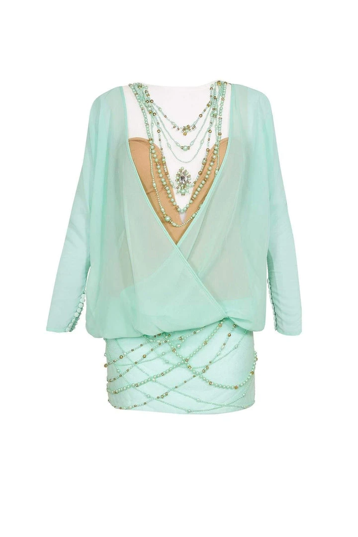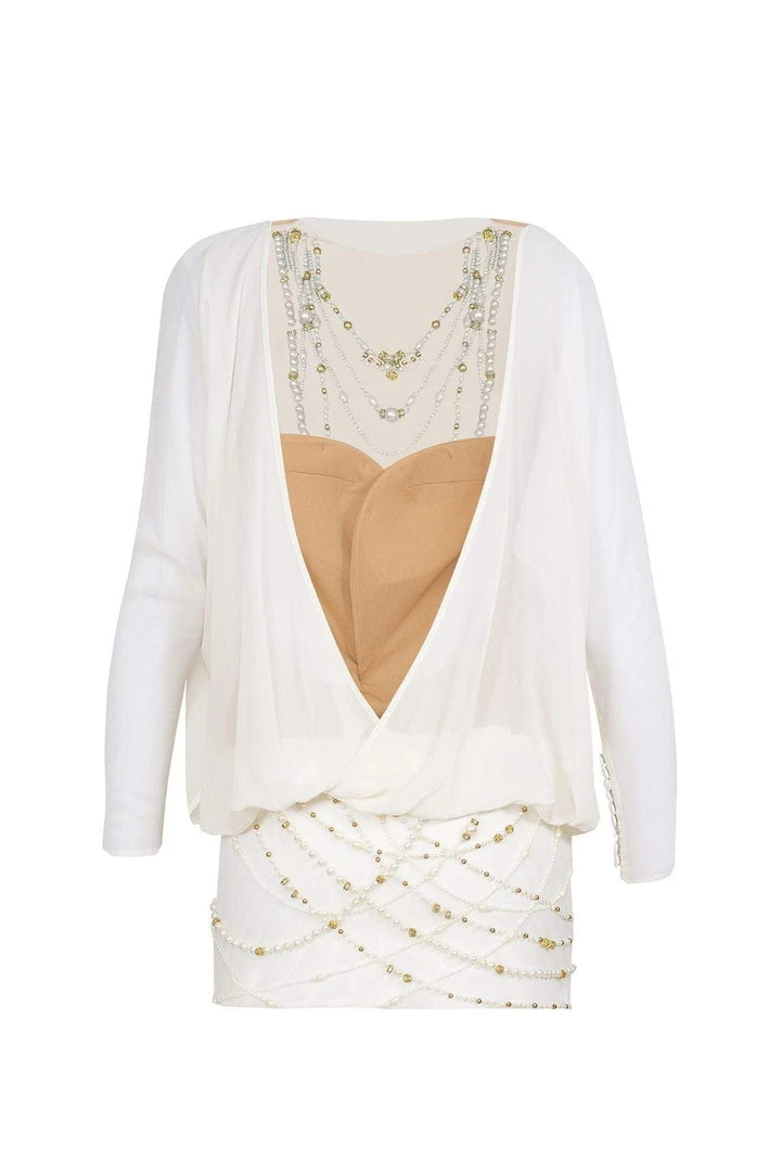 | Details: | Long sleeves, Sheer fabric, Bead embellishments, V-shaped back, Short beaded skirt |