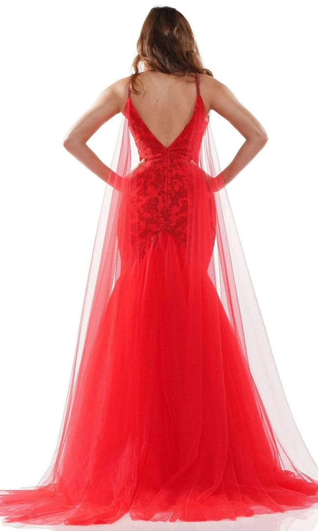 Glide into that spectacular black-tie event like an ethereal vision as you flaunt this gorgeous creation from Colors Dress G962. Adorned with beads and lace appliqued, this stunning gown showcases a sleeveless and plunging V neckline while the open back shows off a V-shaped cut, followed by a center zipper closure. The gown glistens with its beaded straps while a dramatic long cape flows from each side of the shoulder. The skirt flourishes in a full-length mermaid silhouette and ends with a sweep train for added drama. Stand out among the fabulous crowd as all eyes focus on you in this glamorous Colors Dress masterpiece.