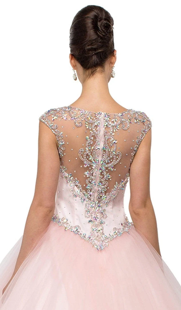 Look like a real life princess in this ball gown. The sleeveless sweetheart bodice is covered and coated in a splendid array of shimmering and twinkling beaded adornments. Sheer embellished back also boost your figure; this beautiful ensemble glides to the full-length ball gown silhouette hem with grace. This gown is a sure winner.