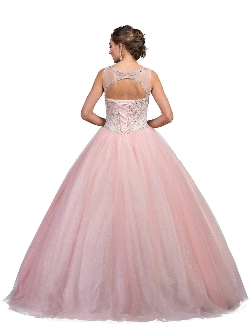 Take their breath away with this stunning gown. Showcases a sleeveless, illusion bateau neckline with sweetheart lined bodice ornate with glittering accents. The back has a cutout, lace up closure and a back zipper. From the basque waist begins a full length ballgown skirt. Look great for your special event in this beautiful masterpiece.