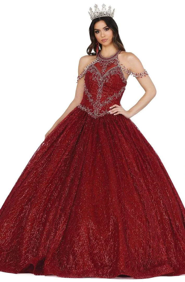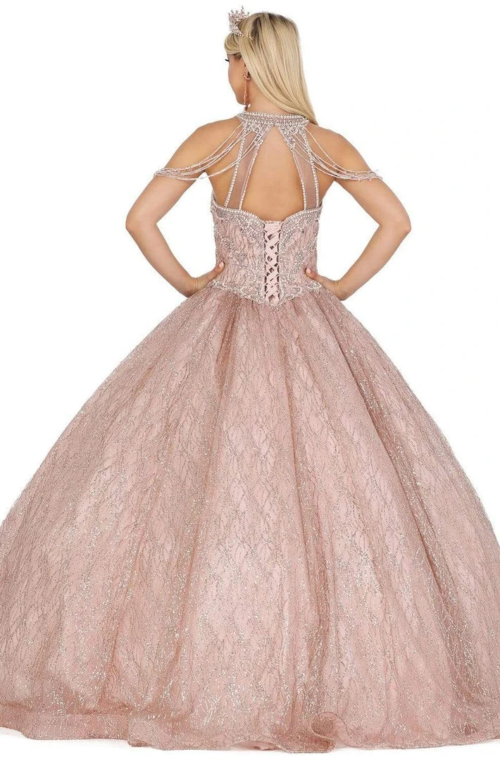 Embrace a wonderful evening in this wondrous formal gown by Dancing Queen 1420. This long gown fashions a halter neckline with chandelier straps. Its fitted bodice is ornate with embellishments that continue to the voluminous ballgown skirt. It has a lace up back for an adjustable fit. Earn your place in the limelight in this ahh-inspiring evening gown by Dancing Queen.