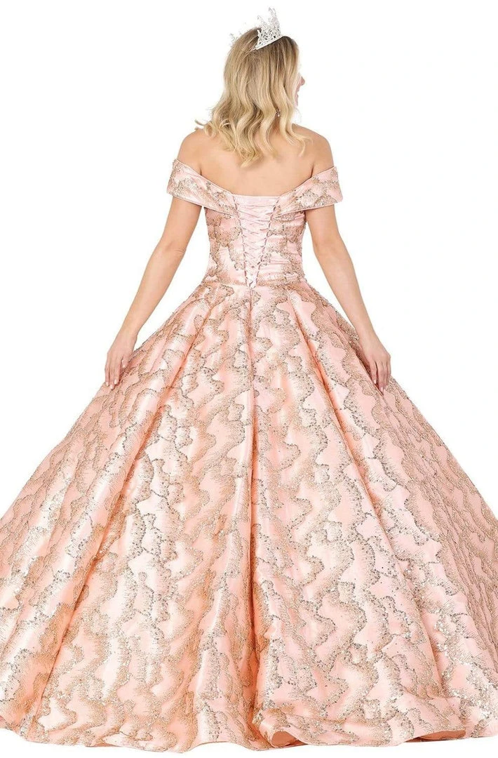 Surround yourself with decadence in a dazzling couture from Dancing Queen 1450. A folded off-shoulder neckline crowns the fitted bodice, complemented with mid-open lace up back as stunning pleats adorn the ballgown skirt which falls to a full length hemline. The whole dress is designed in glitter embellishments which offer the sparkling effect. Beam with pride as you show up in this Dancing Queen creation. Find more quinceanera dresses!