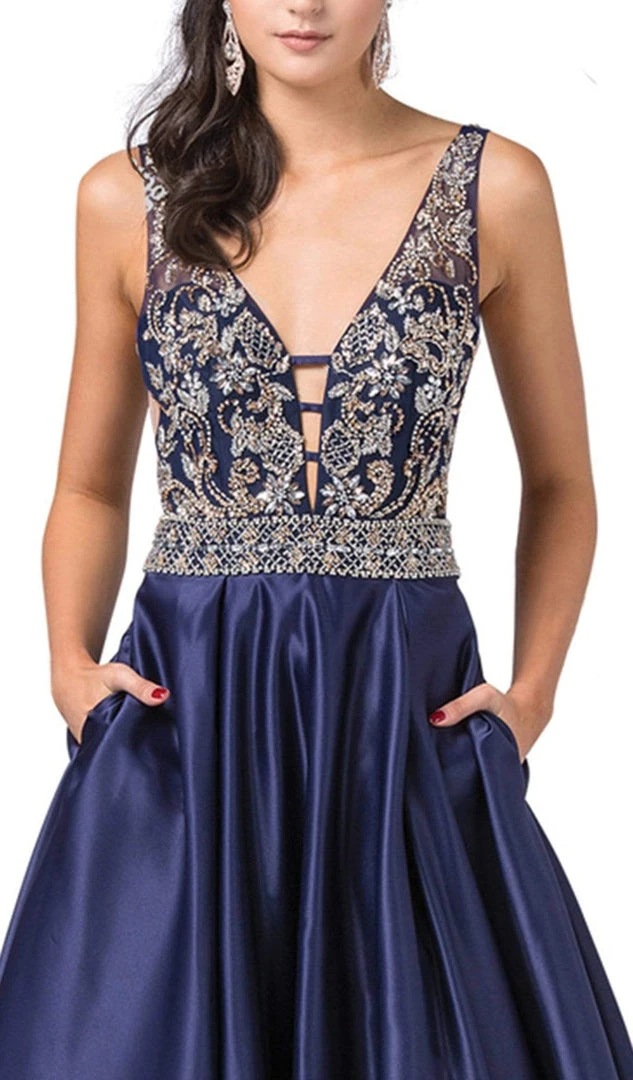 Glow with the stunning elegance like any other in this Dancing Queen 2512 creation. Exquisitely designed with a glistening display of intricate rhinestone motif, this beauty shows a plunging v-neckline accented with ladder banded accents. Captivatingly plunged with a v-open back, the A-line skirt is crowned with a beaded waist before it cascades into a full-length hemline. Craft a night of pure romantic flair in this Dancing Queen masterpiece.