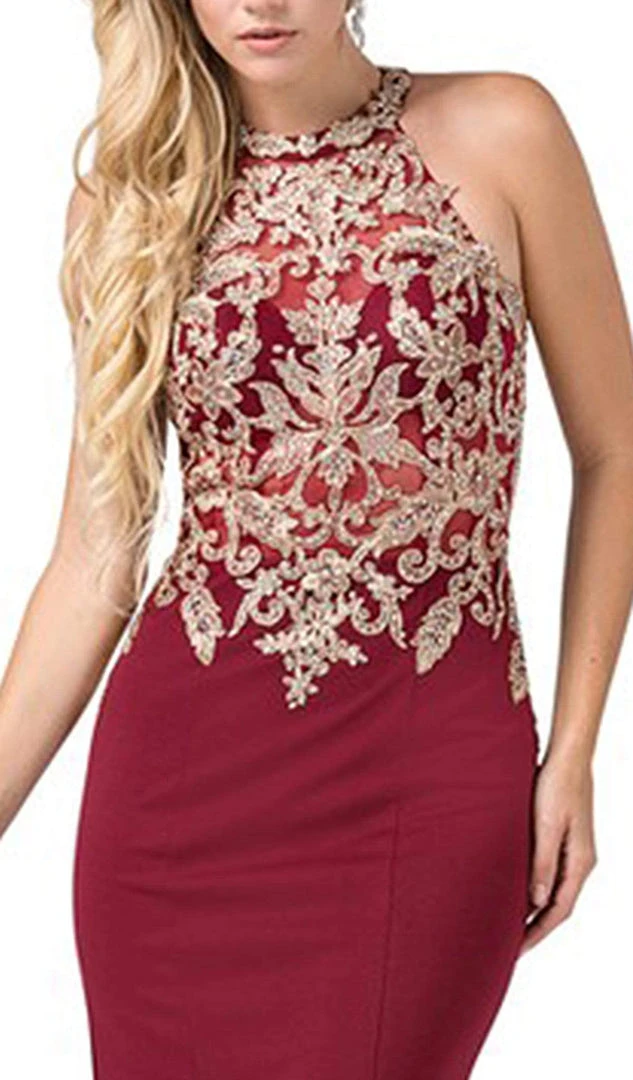 You’ll be positively radiant in this glimmering masterpiece by Dancing Queen 2555. This long gown features a sleeveless, halter neckline with a form-fitting bodice. Designed with embroidery, the dress features an open back and has a zipper closure. The skirt forms a fit and flare silhouette and runs at full length hem to a sweep train finish. Light up the night in this eye-catching Dancing Queen dress.