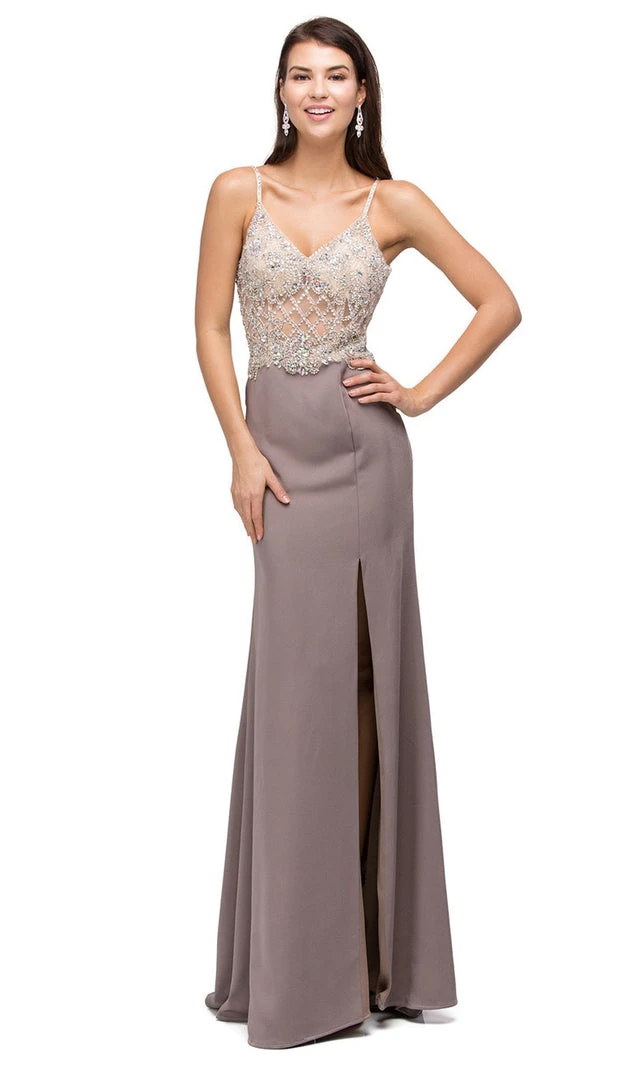 Show off your classy style when you wear this dress. This long floor length prom dress sparkles with luxurious beads and rhinestones. Look good and feel good with this ostentatious extravagant dress!