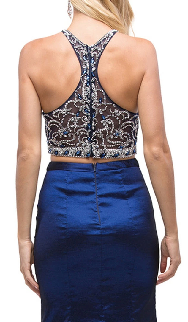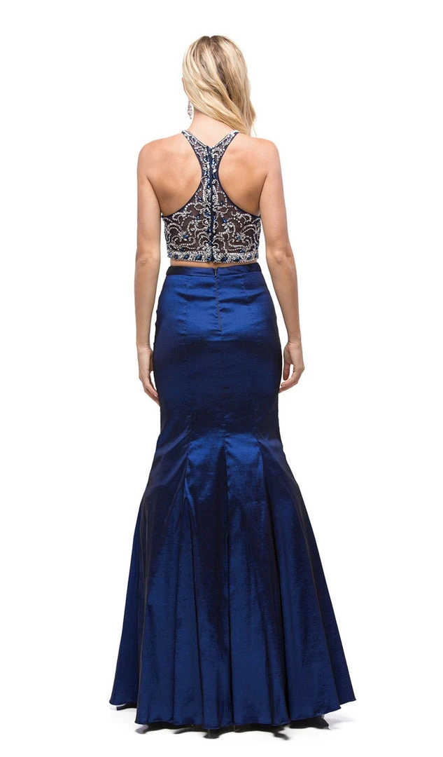 There’s no better way to pair sophisticated style with glamour than with this long dress. The dress fashions a two piece set with a sleeveless, embellished illusion halter crop top with a racerback design. The skirt slims through the thighs and flares a prominent mermaid silhouette. This evening gown will not let anyone miss your grand entrance. Model is wearing Blue color.