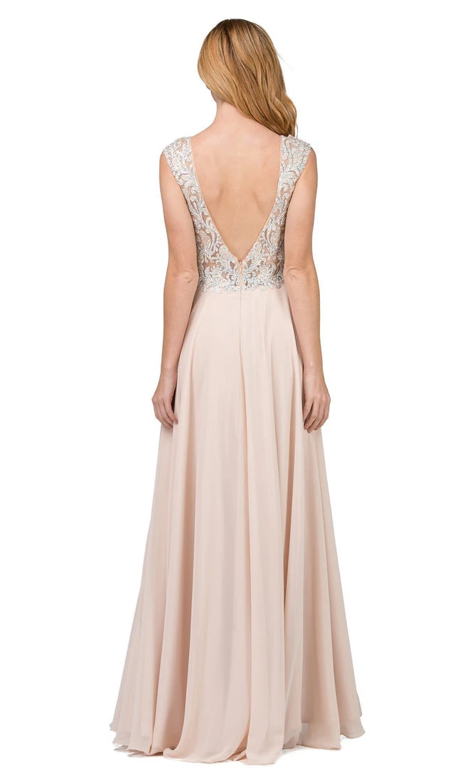 Crafted from soft lace, this ultra-feminine cap sleeve long dress has a romantic style. Featuring dazzling beaded accents on the sheer illusion bodice, deep v-open back and waist this dress will make any occasion special. It’s a classic look that works for many special occasions.