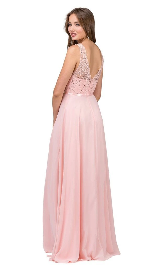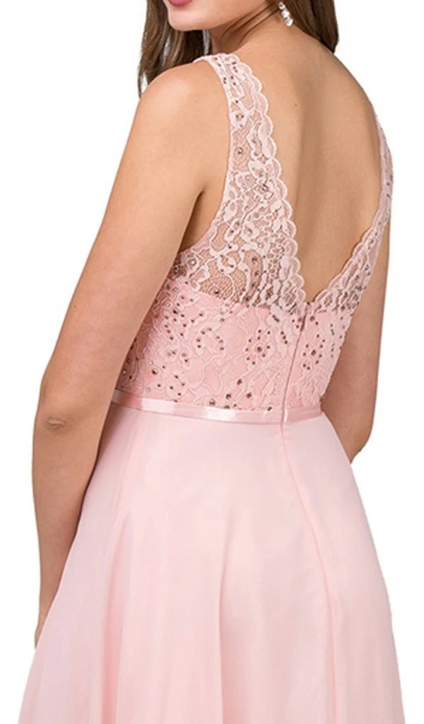 | Details: | Sleeveless, Scalloped trims, Satin Waistband, Sheer Floral Lace, Beaded, Illusion V-Cut Open Back, Back Zipper Closure, Full Length Hem |