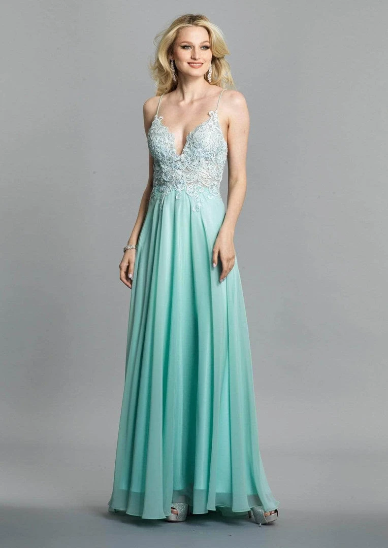 Opulently rendered with romantic lace appliques on a sculpted bodice, thisย beauty unveils a plunging V neckline held by spaghetti straps with semi-sheer midriff and back. The flowing chiffon skirt features ruching that streams down to a perfect full length hemline.ย Model is wearing the Sage color.