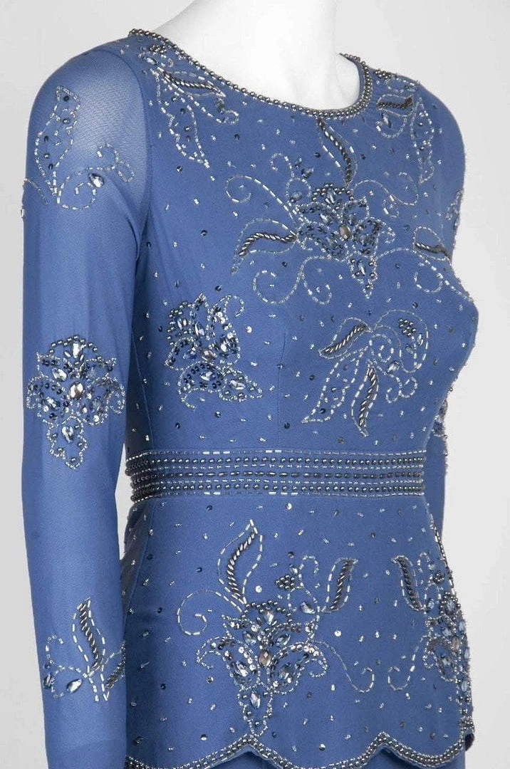 Exude a classy appeal in this picture perfect special occasion dress by Decode 1.8 183951. The dress is packed with stylish punch of sparkles that is fit for royalty as it appeals in beaded trimmed scoop neckline , long sleeves and intricately jewel-beaded embellished bodice. Dashes of horizontal beads encircles the natural waistline and the scalloped hem popover gives an illusion of peplum. The dress is designed to naturally follow your curve from the bodice through the hips before godet pleats perform regal flares and elegantly cascades down to floor length hemline. Oomph with utmost sophistication as you radiate a royal style in this this Slate blue formal gown by Decode 1.8 .