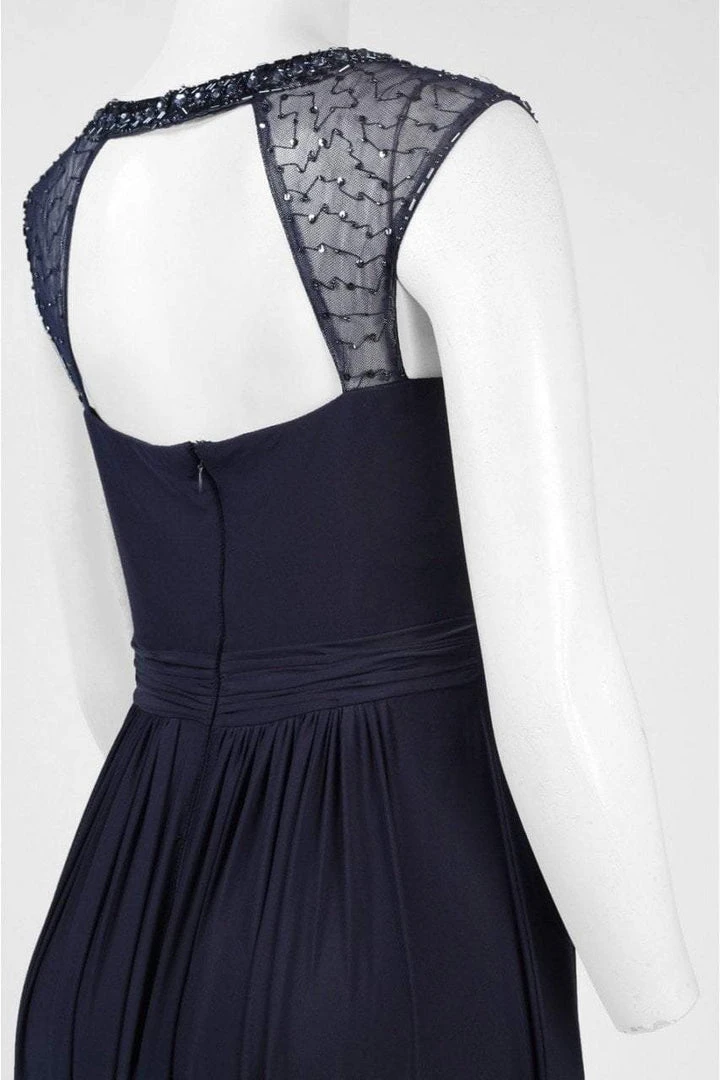 Channel a captivating presence when you walk wearing Decode 1.8 182423. This dress features an embellished high scoop neckline with modest ruched details on the bodice and sequined sheer cap sleeves. The back features a cut out frame. The shirred skirt flows down graciously at floor length hem. This design by Decode 1.8 is sure to grace you up on your next special evening event with a dash of sparkle . The model is wearing the dress in Emerald color