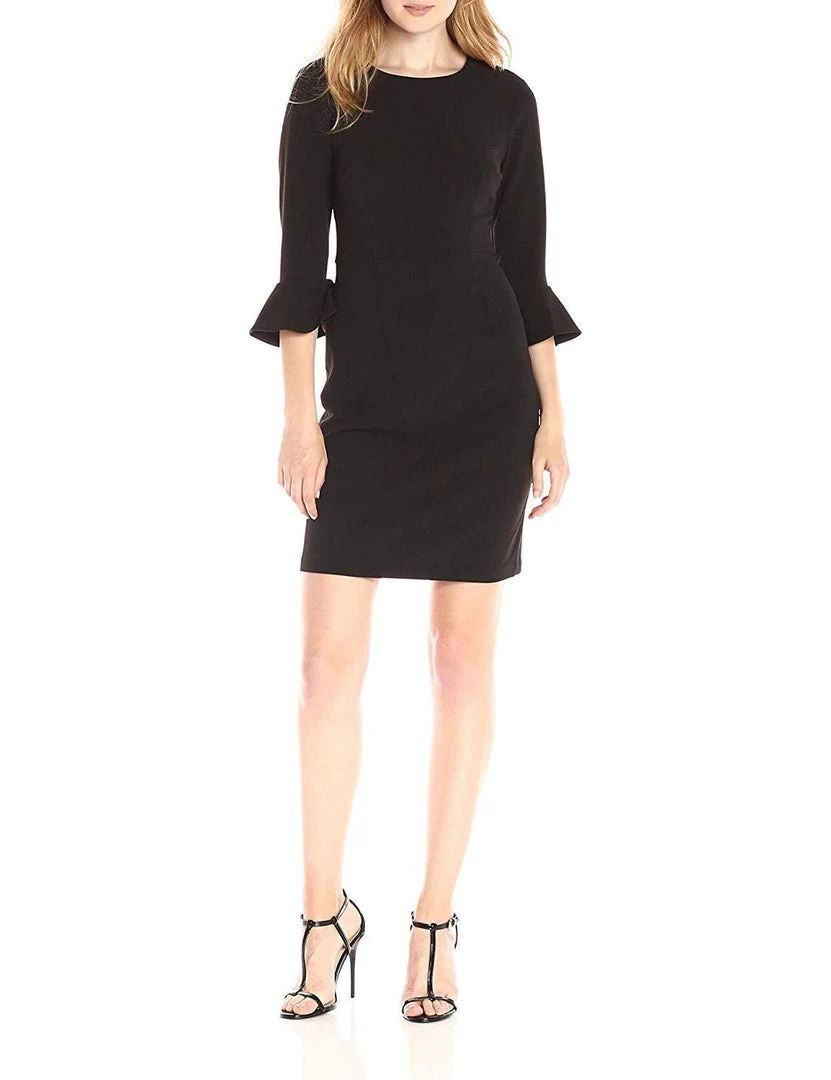 | Details: | Quarter length flounce sleeves, Fitted bodice, Sheath skirt, Back zipper, Stretch crepe |