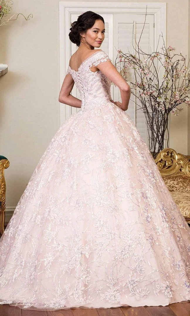 Promote attention-grabbing style in this stunning Elizabeth K GL1942. With wide V neckline and off shoulder sleeves, this voluminous couture is embellished with embroidery and bead appliques. It also uses sequin for shimmer and closes with lace-up back tie. It reaches the floor and parades with a sweep train finish. Go with fun, gorgeous, and youthful dress by Elizabeth K.