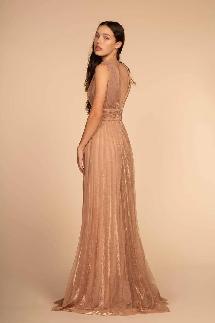 Make a memorable splash at your upscale evening in this lux formal dress by Elizabeth K GL2574. Brandishes in a sleeveless, deep V-neckline with pleated bodice styled with a low V-back. The dress has a back zipper closure and wraps the waist in a wide sash. The skirt flourishes a full length A-line skirt and finishes in a mini train. Envision the ideal evening in this evocative formal dress by Elizabeth K. Model is wearing Rose Gold color.