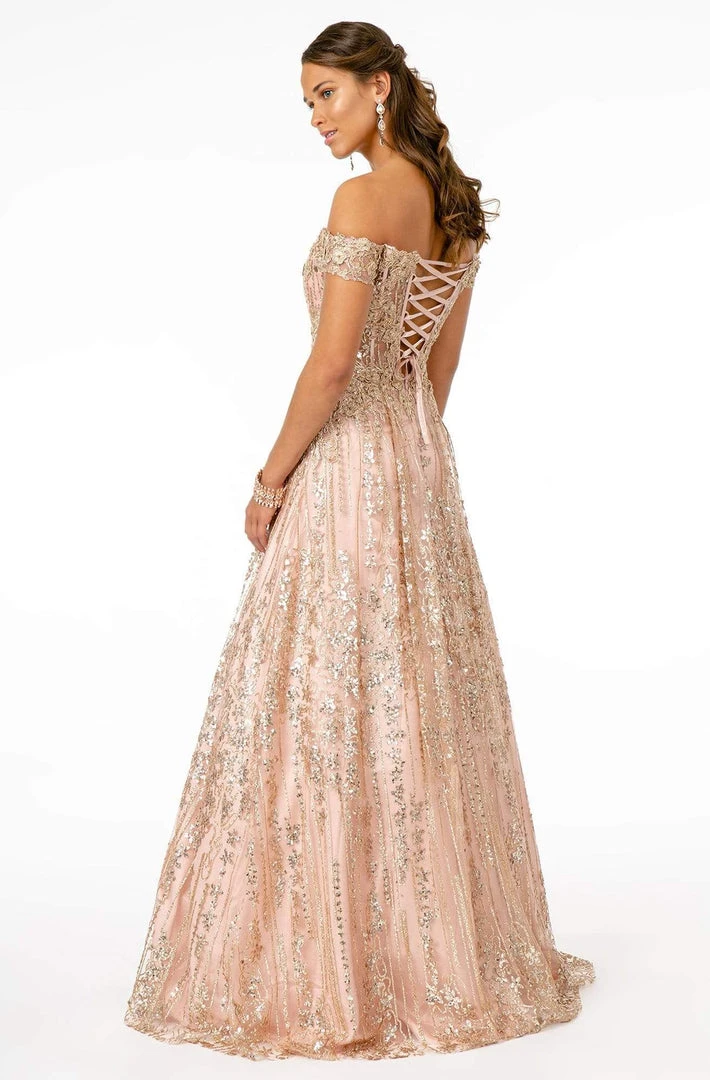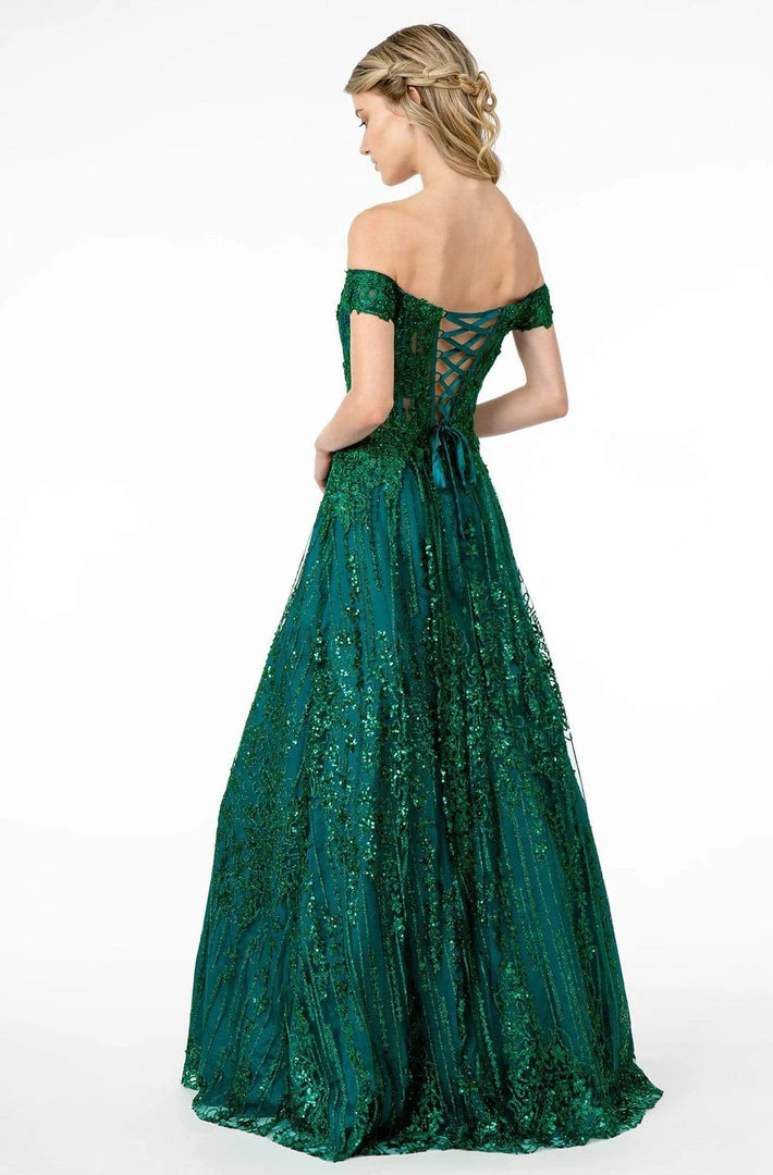 Claim your spot as the darling of the ball with this stunning piece by Elizabeth K GL2941. This embroidered gown delights in an off-shoulder neckline with fitted bodice styled with a lace up back. The skirt fashions a full length A-line silhouette. Waltz into the party looking fabulous in this Elizabeth K look.
