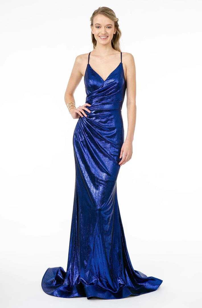 All eyes will be on you in this elegant evening gown by Elizabeth K GL2943. This metallic lame dress allures in a sleeveless, V-neckline with spaghetti straps. The ruched bodice has a lace up back and the skirt forms a trumpet silhouette with a sweep train finish. This Elizabeth K dress is specially designed to make that special occasion worth reminiscing.