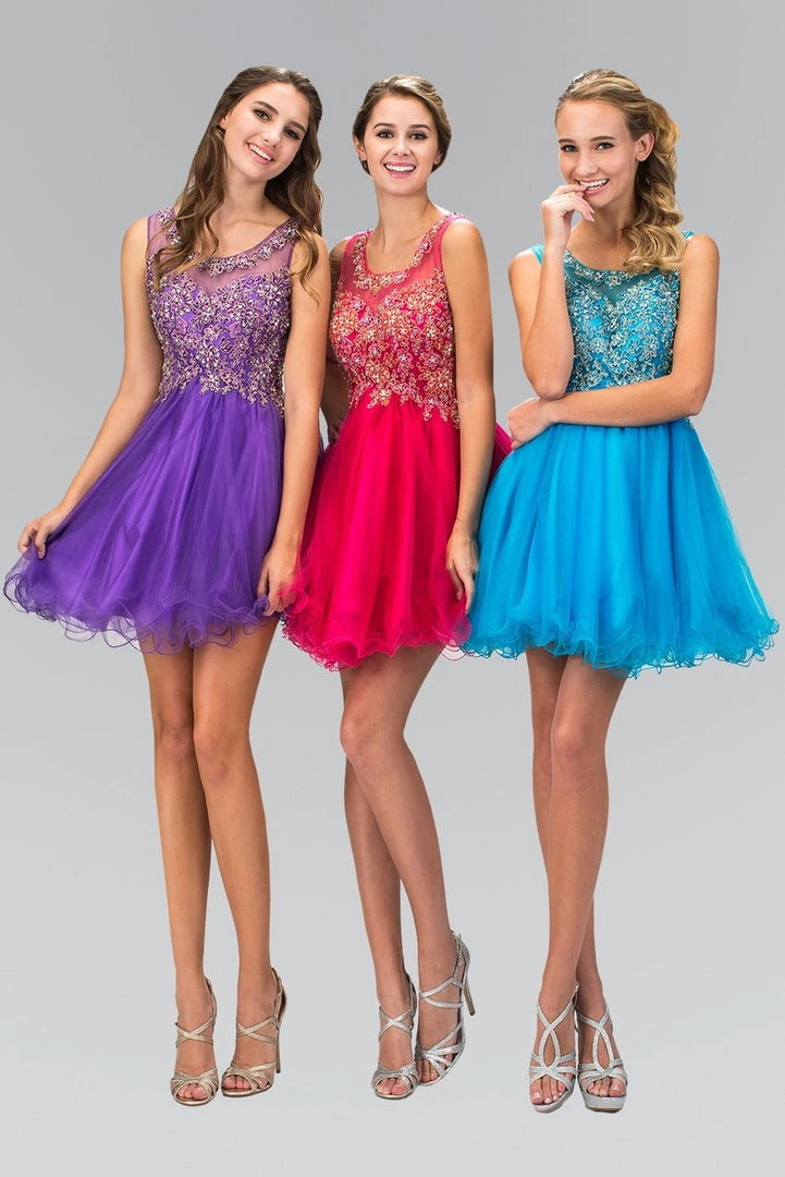 Be a glorious sight at your special event in this jewel-toned creation by Elizabeth K GS1335. Showcasing gold-trimmed floral appliques on a sheer bodice, this splendid piece shows a scoop illusion over a sweetheart neckline and an ornate mesh full back. The tulle A-line skirt flourishes exquisitely down to a rolled short hem. Showcase your finest assets in this vibrant Elizabeth K masterpiece.