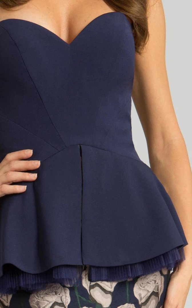 | Details: | Strapless, Floral print skirt, Layered peplum details on the hips, Open back, Back zipper closure |