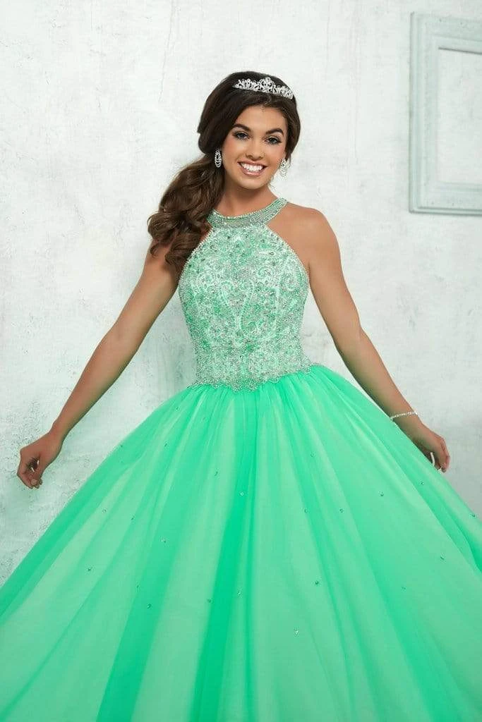 Capture that striking presence and get everyone’s attention in Fiesta Gowns 56316. Charms in a sleeveless, halter neckline with fitted bodice embellished with beading. The back has a lace up closure and from the waist flourishes a full length tulle ballgown skirt. Be ready to fascinate everyone with this Fiesta Gowns design.