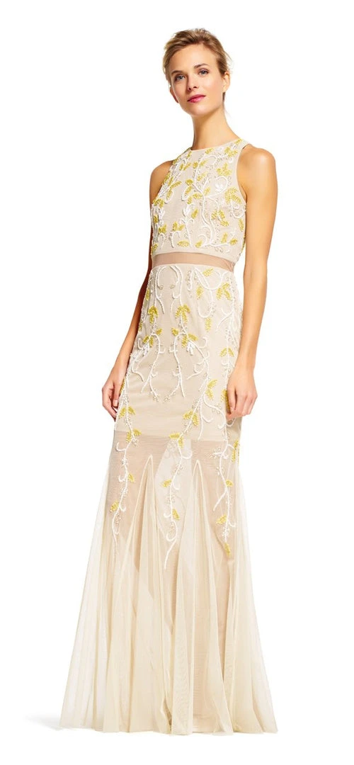 Inspire romance and verve in this vibrantly embellished Adrianna Papell AP1E200993 creation. Intricately embellished with trailing floral beadwork of a sculpted bodice, this refined piece flaunts a sleeveless, halter neckline with a cutaway treatment and an ornate full back. Exhibiting a sheer inset fabric embracing the midriff, the full-length gossamer skirt flaunts a similar streaming floral beadwork down to a godet embellished hem. Live your very own fairy tale in this stunning Adrianna Papell masterpiece.