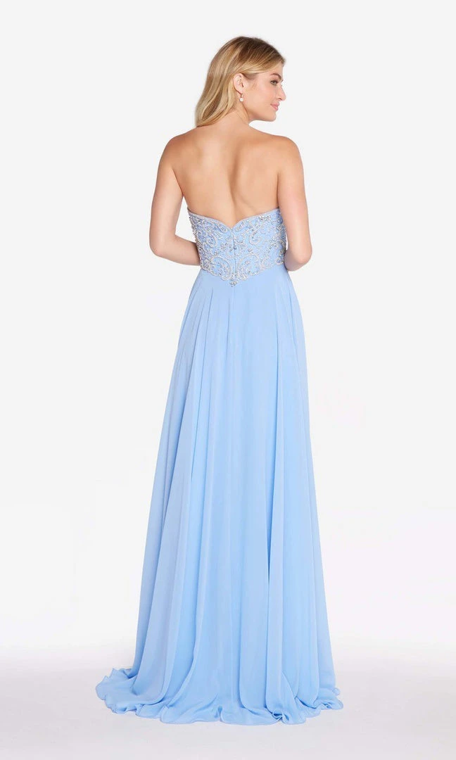 | Details: | Strapless, Embellished Bodice, High Slit, Mid-Open Back, Back Zipper Closure, Chiffon, Sweep Train |