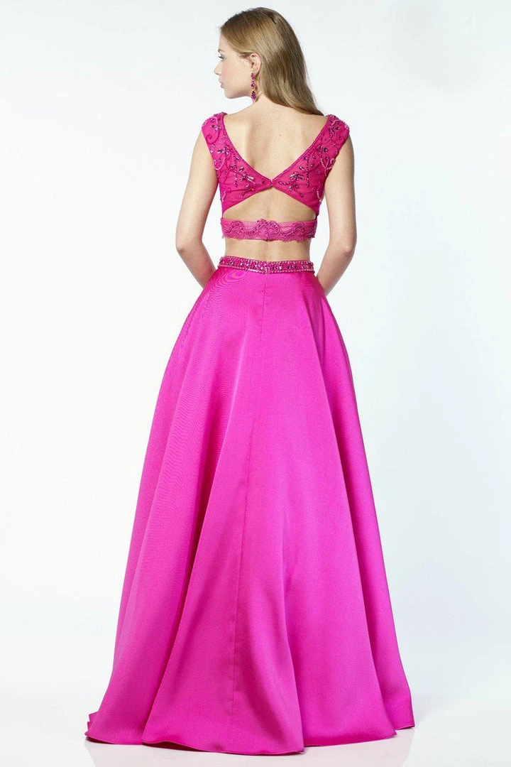 Two piece with a mikado skirt, breathtaking beaded fishnet top with a cut out back.