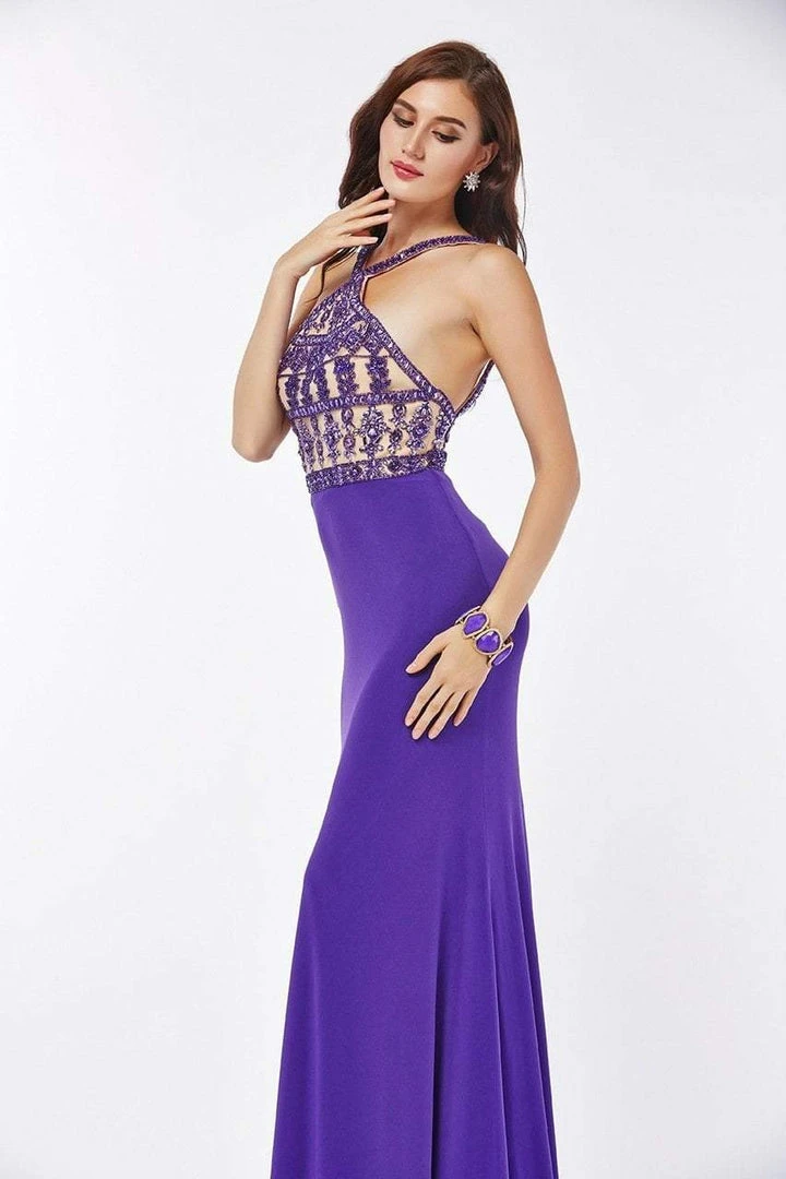 This stunning floor length halter dress will be the most glamorous dress at your prom. The halter bodice is detailed with embellishments, which adds a nice feminine touch. Pair this halter dress with silver drop earrings, and you will be all set for a night to remember.