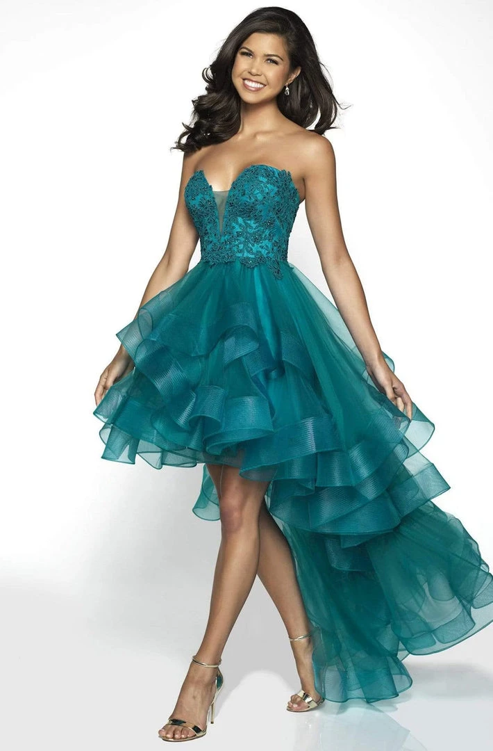 | Details: | Strapless, Rhinestones, Lace Appliques, Illusion Mesh Inset, Mid-Open Back, Back Zipper Closure, Horsehair Trims, Ruffles, High Low Hem |