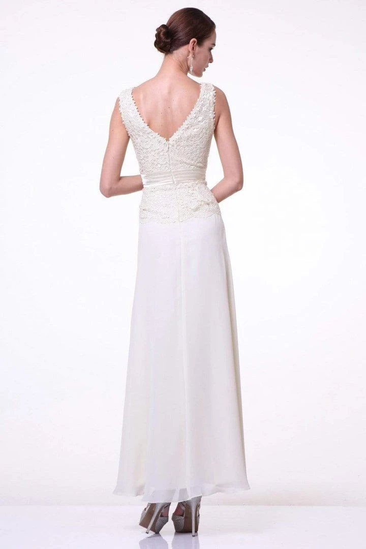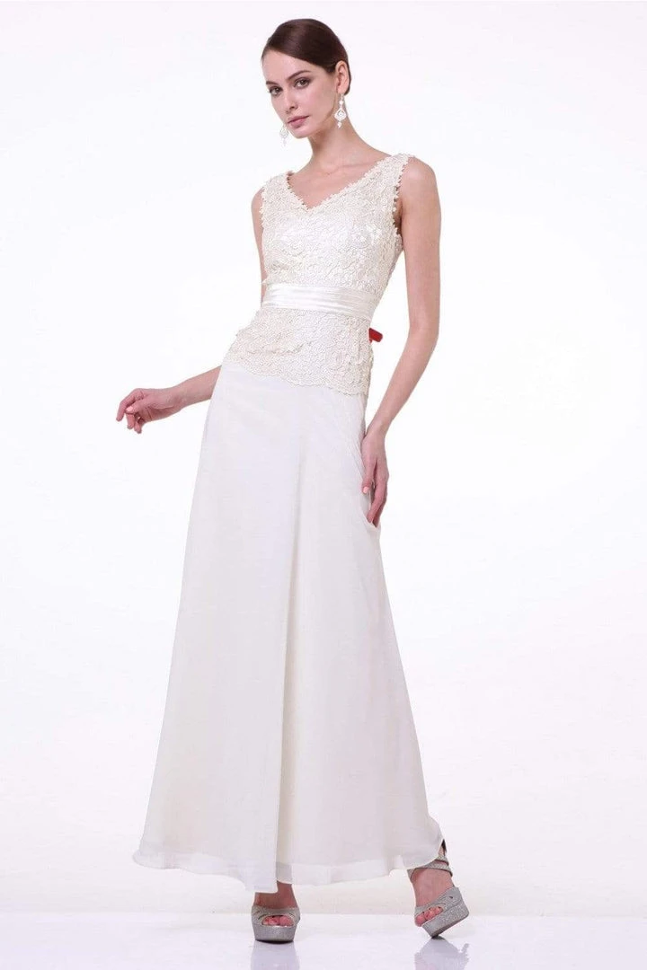 Dazzle his eyes with your sophisticated iridescence in this timeless Cinderella Divine 1455 creation. Ornamented with tonal sequins on a lace bodice, this chic piece shows a v-neckline paired with a deep v-cut open back on a sleeveless silhouette. Adorned with a scalloped peplum detail, this stunner is hugged around the waist with a pleated band. The A-line skirt beautifully flares down to create a full-length hemline. Charm everyone by your sheer perfection in this classy Cinderella Divine masterpiece. Models are wearing the Cream, Black and Eggplant colors.